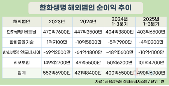 3분기까지의 순이익은 109억1300만 원으로, 기존 4개 법인과 합치면 한화생명은 해외 종속법인에서 600억 원에 육박하는 순이익을 냈다.