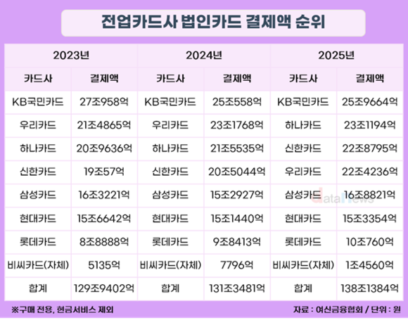 법인카드 시장에서 선두를 달리는 카드사는 KB국민카드다. KB국민카드는 2023년부터 2025년까지 최근 3년 연속 법인카드 결제액 1위 자리를 놓치지 않고 있다.