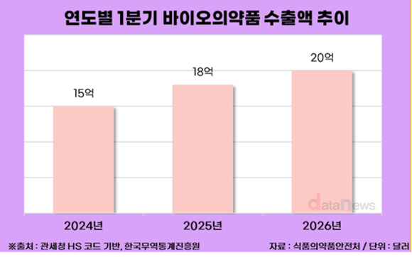 13일 데이터뉴스가 식품의약품안전처의 '2026년 1분기 K-바이오의약품 수출' 자료를 분석한 결과, 올해 1분기 바이오의약품 수출 규모는 20억 달러(잠정)을 기록했다. 전년 동기(18억 달러)보다 11.1% 증가하며 최대 기록을 달성했다.