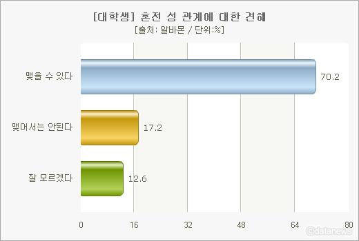 아르바이트 포털 알바몬은 7월28일부터 8월4일까지 대학생 715명 대상으로 <성 의식>에 대해 설문조사를 실시했다. 조사결과, 응답자의 70.2%가 ‘혼전 성 관계를 맺을 수 있다’고 밝혔다.