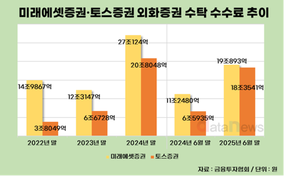 다만 토스증권이 매년 수탁수수료를 대폭 늘리고 있어 양사가 선두 자리를 두고 치열한 경쟁을 벌일 것으로 전망되고 있다. 토스증권의 올해 상반기 수탁수수료는 18조3541억 원으로, 전년 동기(6조5935억 원) 대비 3배 가까이 증가했다.