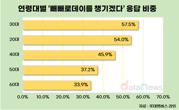 롯데멤버스 라임의 설문조사에 따르면 30대의 10명 중 6명은 빼빼로데이를 챙기겠다고 응답했다.