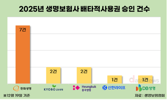 한화생명이 가장 많은 배타적사용권을 획득했다. 총 7건으로, 전체(13건)의 53.8%을 차지했다. 올해 생보사가 획득한 배타적사용권 2건 중 1건은 한화생명인 셈이다.