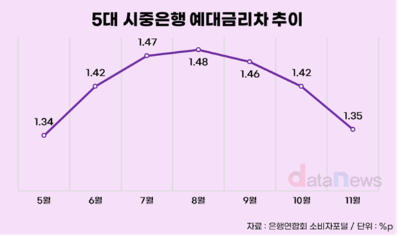 28일 데이터뉴스가 은행연합회 소비자포털에 공시된 5대 시중은행의 예대금리차(정책서민금융 제외) 추이를 분석한 결과, 지난해 11월 시중은행들의 예대금리차 평균은 1.35%p로 집계됐다.