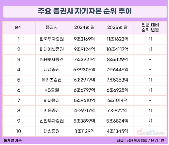 증권사들의 자기자본 순위에 변동이 생겼다. 지난해 증권사들이 유상증자와 신종자본증권 발행 등을 통해 자본확충에 나선 영향이다. 한국투자증권이 미래에셋증권을 제치고 1위에 올랐고, 메리츠증권과 KB증권, 키움증권과 신한투자증권도 각기 순위가 뒤바꼈다.