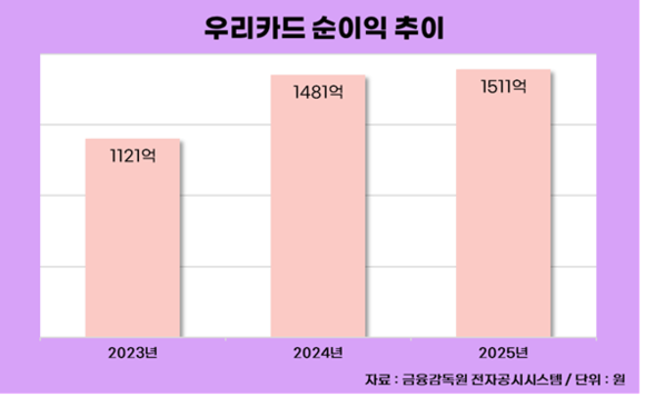 이에 힘입어 우리카드의 순이익은 최근 3년 연속 성장세를 보이고 있다. 2023년 1121억 원에서 2024년 1481억 원, 2025년 1511억 원으로 확대됐다.