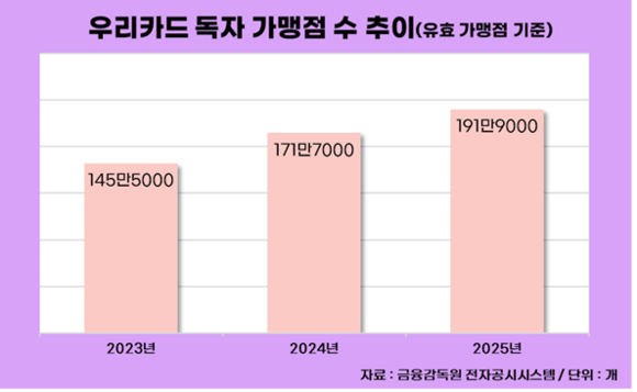 지난해 말 독자 가맹점 수는 191만9000개로 200만 개를 눈 앞에 두고 있다. 자체 결제망을 구축한 2023년 145만5000개에서 2024년 171만7000개로 18.0% 증가했고, 지난해에도 11.7% 늘었다.