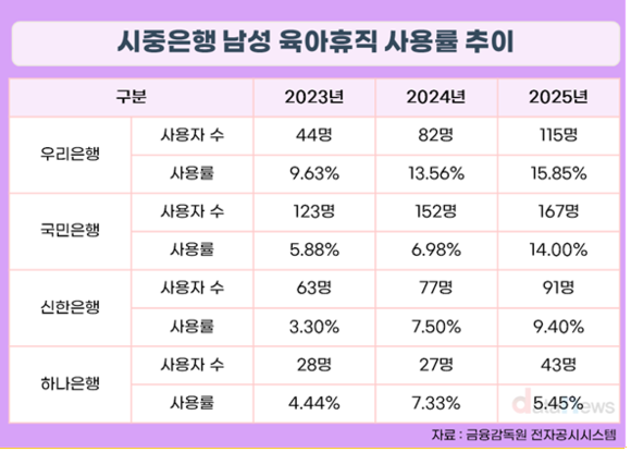 4개 은행 중 남성 육아휴직 사용률이 가장 높은 곳은 우리은행이다. 2024년과 2025년 사용률이 13.56%, 15.85%로 2년 연속 10%를 넘기며 은행권 중 선두를 달리고 있다.
