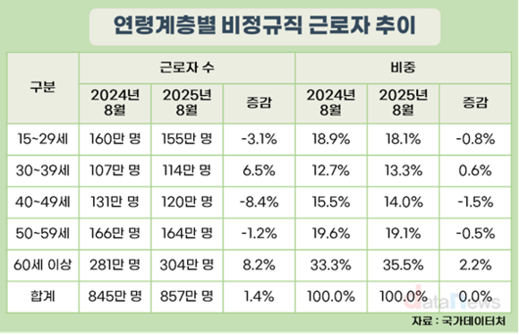 23일 데이터뉴스가 국가데이터처의 2025년 8월 경제활동인구조사 근로형태별 부가조사 결과를 분석한 결과, 올해 8월 말 비정규직 근로자가 857만 명으로 집계됐다. 전년 동기(845만 명) 대비 1.4% 증가했다.