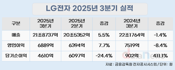 LG전자는 3분기 연결기준 매출 21조8737억 원(QoQ +5.5%, YoY -1.4%), 영업이익 6889억 원(QoQ +7.7%, YoY -8.4%)을 기록했다고 31일 밝혔다.