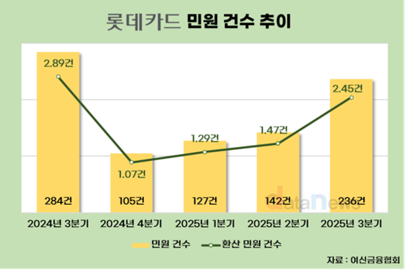 롯데카드의 민원 건수가 급증했다. 8월 말 발생한 해킹사고로 단기간에 민원이 몰린 것으로 풀이된다. 티메프 사태로 인해 민원 건수가 늘었던 지난해 3분기와 유사한 수준의 민원이 접수됐다.