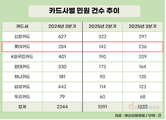 하지만 롯데카드는 감소폭이 가장 미미했다. 올해 3분기동안 지난해에 대응하는 민원이 접수됐기 때문이다. 롯데카드의 올해 3분기 민원 건수는 236건으로, 전년 동기(284건) 대비 48건(16.9%) 줄어드는 데 그쳤다.