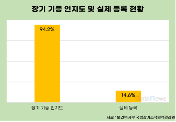 13일 보건복지부 국립장기조직혈액관리원의 2025년 장기·인체조직기증 국민 인식 조사 결과에 따르면, 우리나라 국민의 장기기증 인지도는 94.2%로 매우 높았다. 하지만 인지하고 있는 국민 중 실제로 기증 희망 등록을 했다고 응답한 비율은 14.6%에 불과했다.
