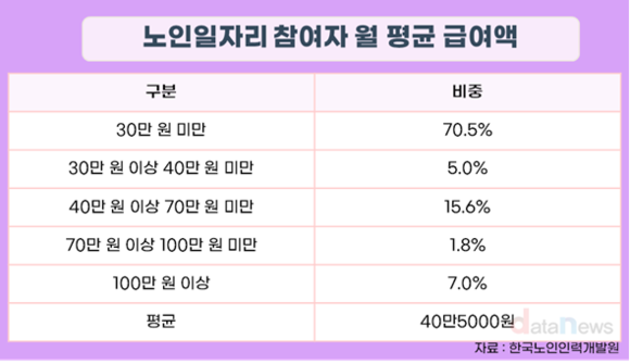20일 데이터뉴스가 한국노인인력개발원의 '2025년 노인일자리 및 사회활동 지원사업 실태조사'를 분석한 결과, 지난해 노인일자리 사업 참여자들의 월 평균 급여액은 40만7000원으로 집계됐다.