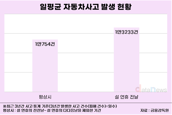 9일 데이터뉴스가 금융감독원의 '설 연휴 자동차사고의 특징' 자료를 분석한 결과, 본격 귀성길에 오르는 설 연휴의 전날(올해는 2월 15일)에는 사고 건수가 일 평균 1만3233건으로 평상시보다 23.1%(+2479건) 증가한 것으로 집계됐다.
