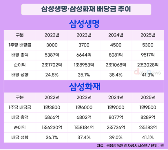 25일 데이터뉴스가 금융감독원 전자공시시스템에 공시된 삼성생명과 삼성화재의 현금·현물 배당 결정 자료를 분석한 결과, 지난해 결산 주당 배당금은 5300원, 1만9500원씩으로 집계됐다. 전년(4500원, 1만9000원) 대비 17.8%, 2.6%씩 증가했다.