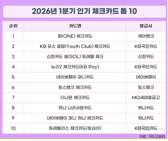 6일 신용카드 플랫폼 카드고릴라가 발표한 2026년 1분기 인기 체크카드 톱10에 따르면, 케이뱅크 원(ONE) 체크카드가 인기카드 1위를 차지했다.