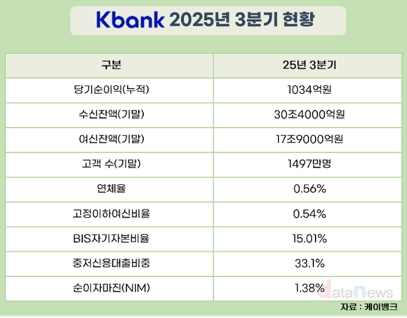 3분기 말 기준 고객 수는 1497만 명으로 전년 동기 대비 약 300만 명 늘었으며, 10월 초에는 1500만 명을 돌파했다. 수신 잔액은 30조4000억원, 여신 잔액은 17조9000억원으로 지난해 같은 기간과 비교해 각각 38.5%, 10.3% 증가했다.