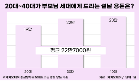 20~40대는 부모님에게 설날 용돈으로 평균 22만7000원을 드린다는 조사 결과가 나왔다. 이번 조사는 카카오페이 사용자들이 송금 봉투로 드리는 용돈을 기준으로 했다.