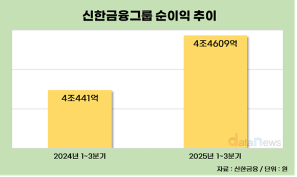 신한금융그룹은 2025년 3분기 누적 당기순이익이 4조4609억 원을 기록했다고 28일 밝혔다. 견조한 핵심이익의 성장과 전년도 발생했던 일회성 비용의 소멸 영향 등으로 전년 동기 대비 10.3% 증가했다.