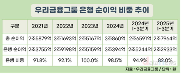 우리금융그룹은 4대 그룹 중 유일하게 90% 이상의 은행 의존도를 기록하고 있었다. 우리은행이 그룹 대부분의 수익을 책임지고 있어 금융그룹 전체 순이익 규모를 늘리기 어려운 구조였다.
