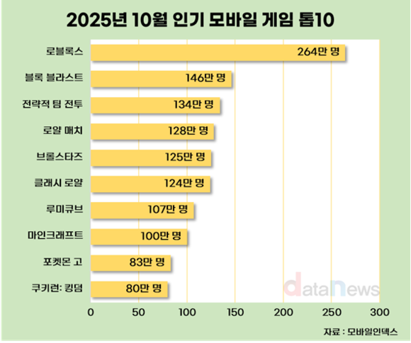 12일 데이터뉴스가 모바일인덱스의 '2025년 10월 인기 모바일 게임 톱10'을 분석한 결과, 인기 모바일 게임 1위는 로블록스가 차지했다. 로블록스의 10월 사용자 수(AOS+안드로이드)는 264만 명으로 집계됐다.