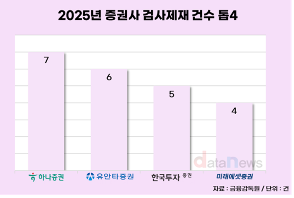 증권사별로 보면 하나증권이 7건으로 가장 많았다. 2024년 한 건의 제재도 받지 않았던 것과 비교된다. 다만 하나증권의 제재현황을 상세히 보면 7건 중 3건만 기관제재를 받았다. 기관주의 1건과 기관경고 1건(과태료 34억3000만 원 포함), 과태료 780만 원 등이다.