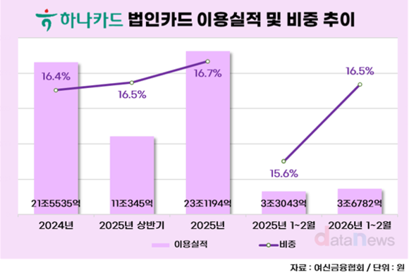 올해 1~2월 전업카드사들의 법인카드 결제액 중 하나카드가 차지하는 비중은 16.54%로, 전년 동기(15.60%) 대비 0.94%p 증가했다.